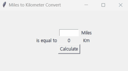 kilometer_result_label = Label(text="0") #input으로 입력된 Miles을 kilometer 전환 기본값0