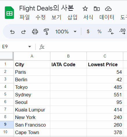 먼저 밑의 Flight Deals를 사본으로 구글 스프레드 시트에 저장한다(이를 통해 Sheety에 연결)